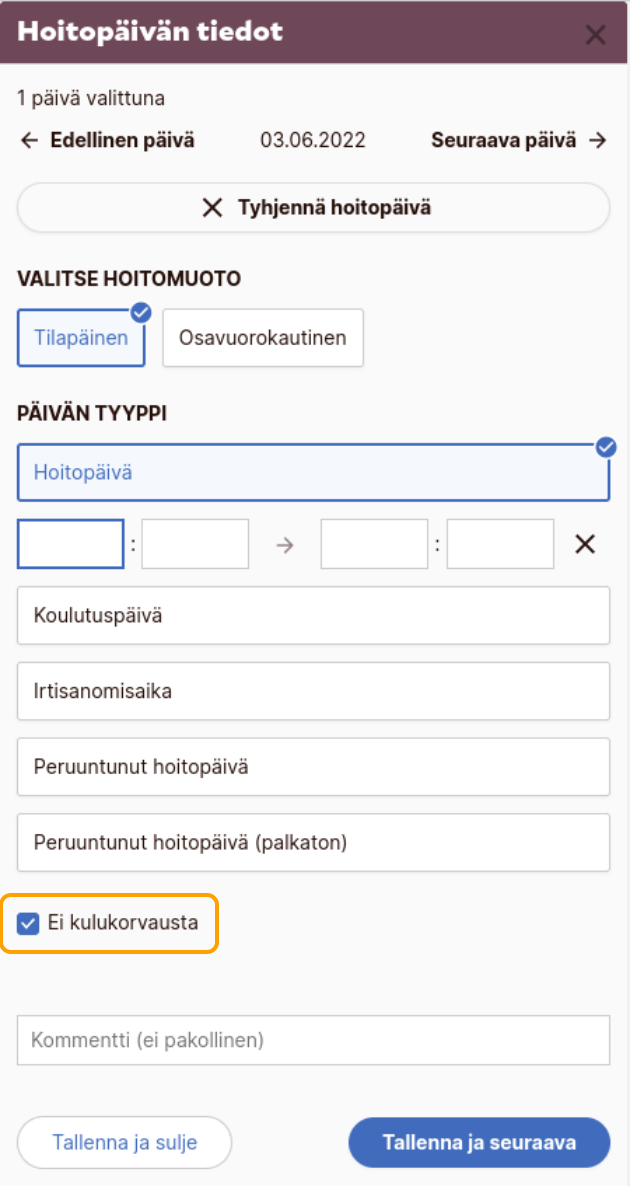 "Ei kulukorvausta" täppä hoitopäivän tiedoissa hoitopäivä-näkymässä.