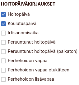 Voit valita mitkä hoitopäiväkirjaukset hoitojaksolta on löydyttävä jotta ne tulevat laskutusraportille. Mikäli et valitse mitään otetaan mukaan kaikki hoitopäiväkirjaukset. Ensimmäistä kertaa laskutusraportille tullessa on hoitopäivä oletuksena valittuna. Oletuksena hoitopäiväkirjaukseksi on valittu hoitopäivä.