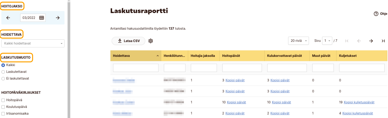 Kulukorvattavat päivät -sarakkeella näkyy niiden hoitopäivien määrä joilta on vähennetty ne hoitopäivät joille on merkitty "ei kulukorvausta" hoitopäivissä. Tietoa voidaan käyttää omien laskutusperusteiden mukaan.