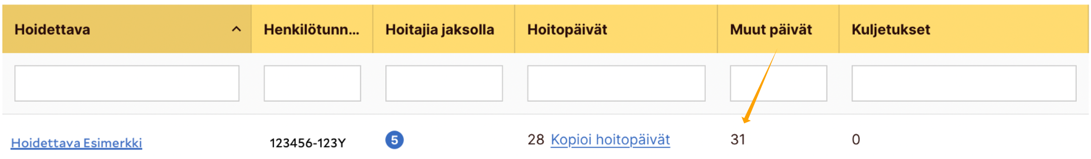 Muut päivät sarake viittaa muihin merkintöihin kuin toteutuneeseen hoitopäivään. Tämä kertoo, että jotain muutoksia on hoitopäivissä.
