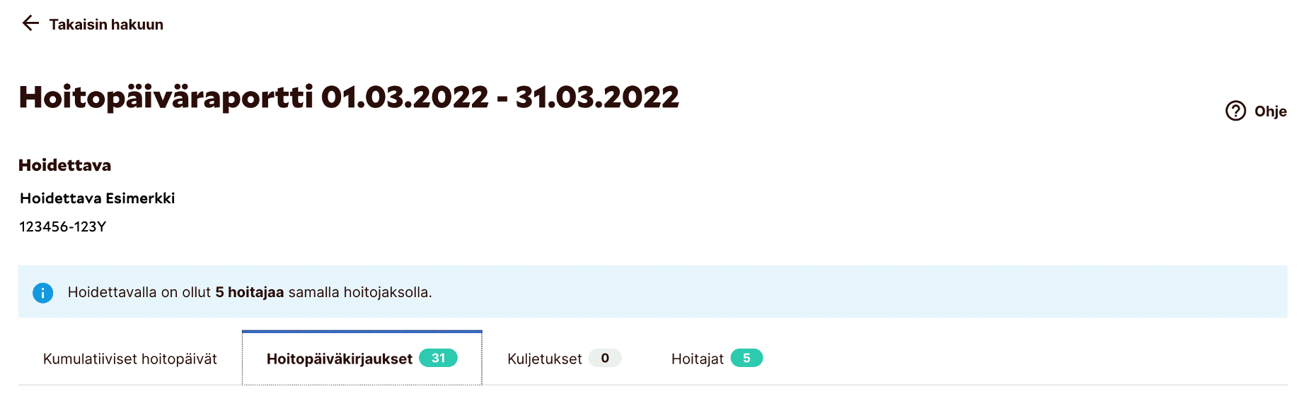 Hoitopäiväraportissa voit tarkastella hoidettavan kumulatiivisia hoitopäiviä per vuosi, tarkempia hoitopäivien ajankohtia ja tyyppejä ja kuljetusten päivämääriä.