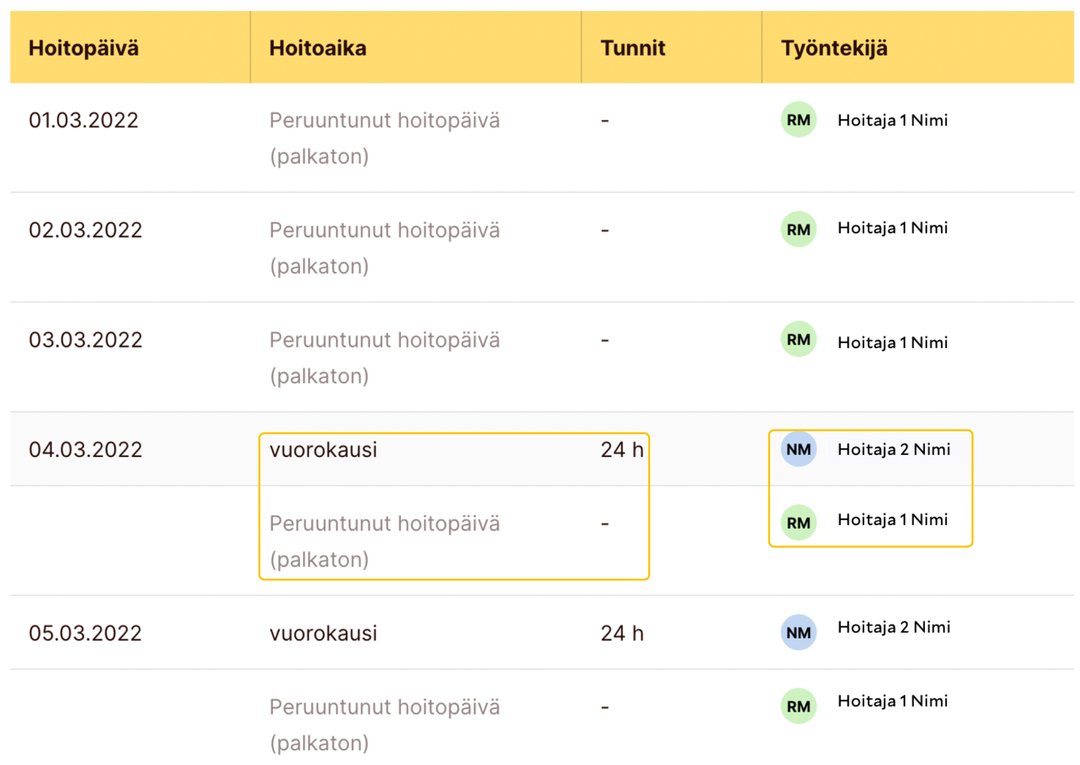 Kuvan mukaisesti on heti nähtävissä, että siellä on peruuntuneita hoitopäiviä ja niiden tilalla on ollut toinen hoitaja joinain päivinä.