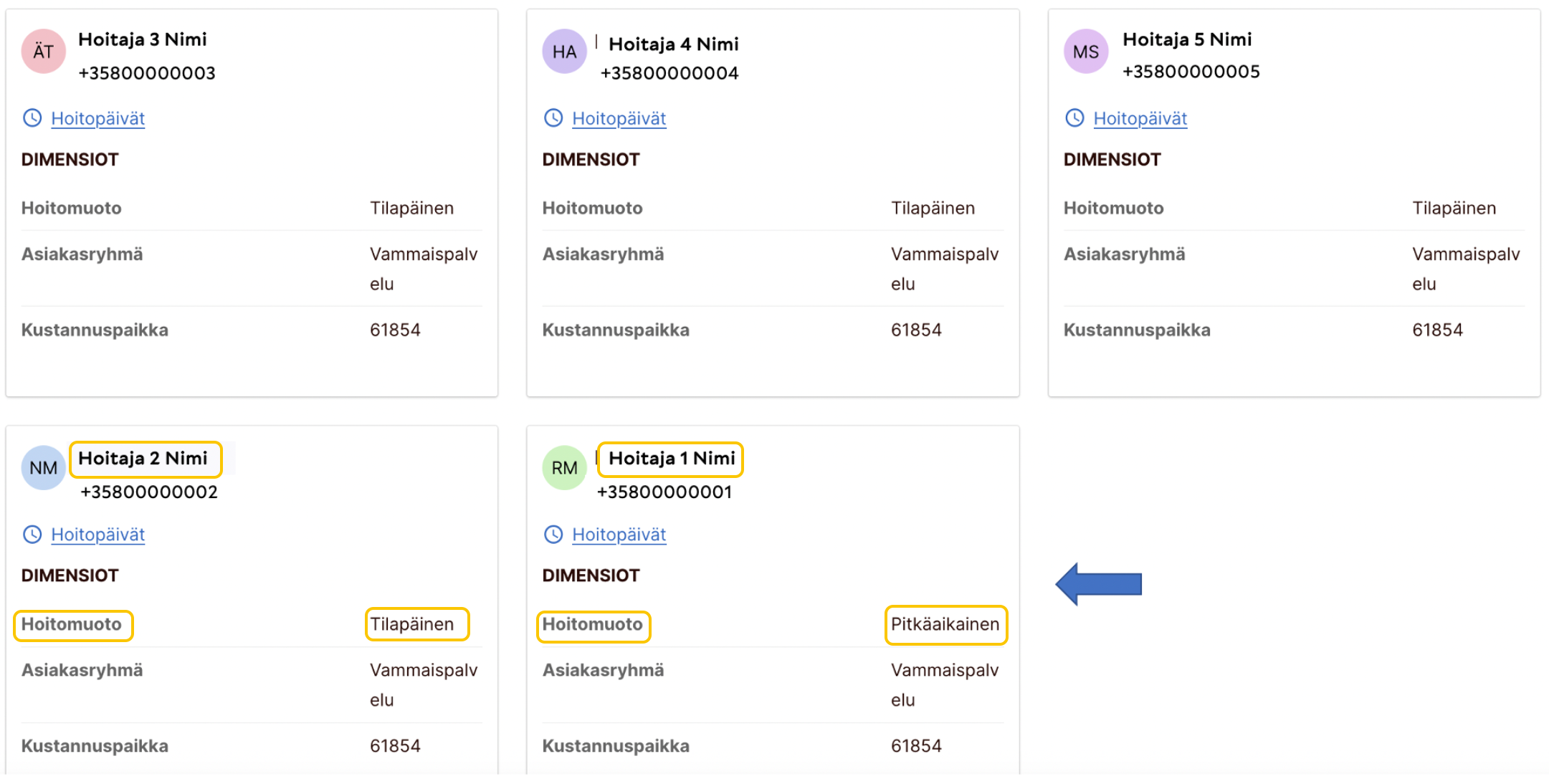 Sopimusdimensiot näkyvät rivin oikeassa laidassa. Mikäli hoidettavalla on kuitenkin ollut useampi hoitaja ovat dimensiosarakkeet tyhjiä koska useampaa eri dimensiota ei voida sarakkeilla näyttää. Näet sopimusdimensiot menemällä hoitopäiväraportille hoidettavan nimeä napsauttamalla.