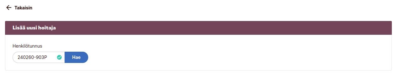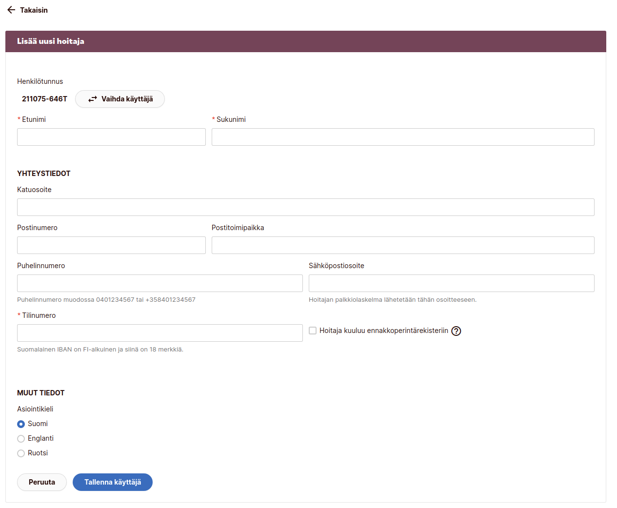 Lisää ensin hoitajan henkilötunnus, paina Hae ja täytä sen jälkeen muut perustiedot. Lopuksi Tallenna käyttäjä.