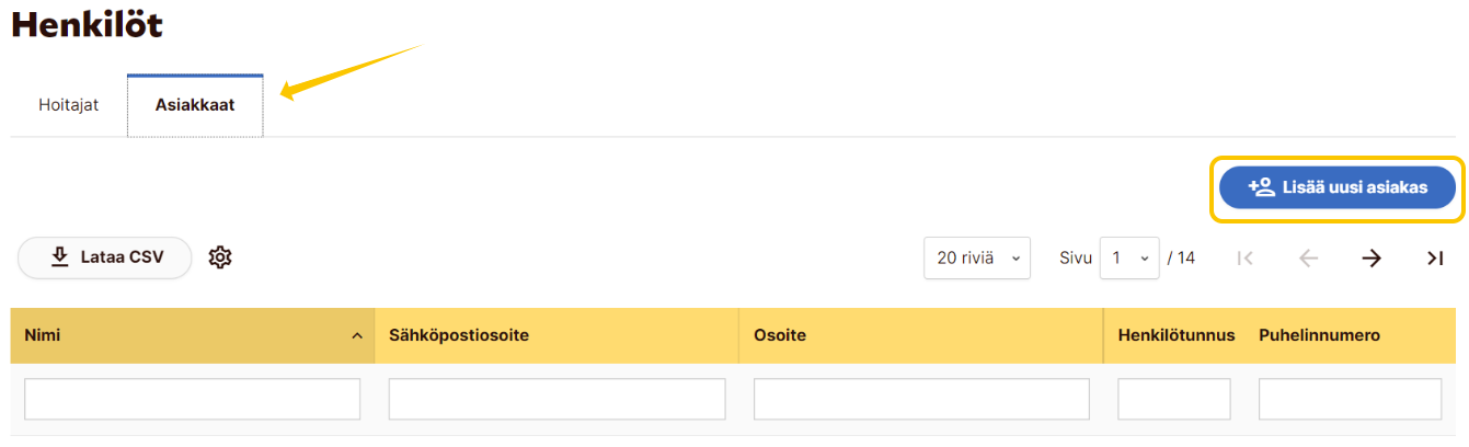 Uusi asiakas lisätään samalla tavalla kuin hoitajan tiedot. Asiakkaat - välilehdellä valitaan Lisää uusi asiakas.