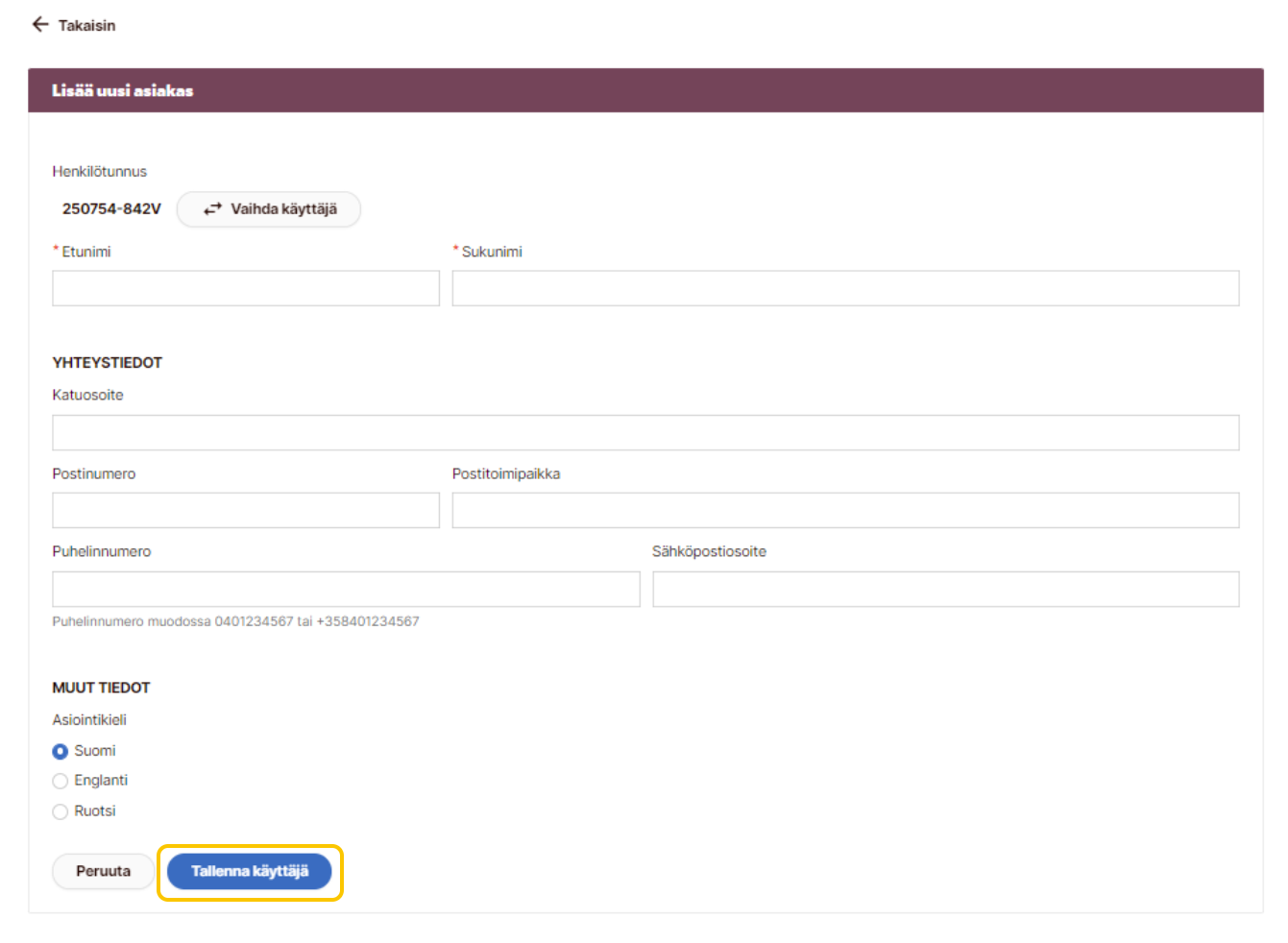 Lisää ensin asiakkaan henkilötunnus, paina Hae, ja täytä sen jälkeen muut perustiedot. Lopuksi Tallenna käyttäjä.