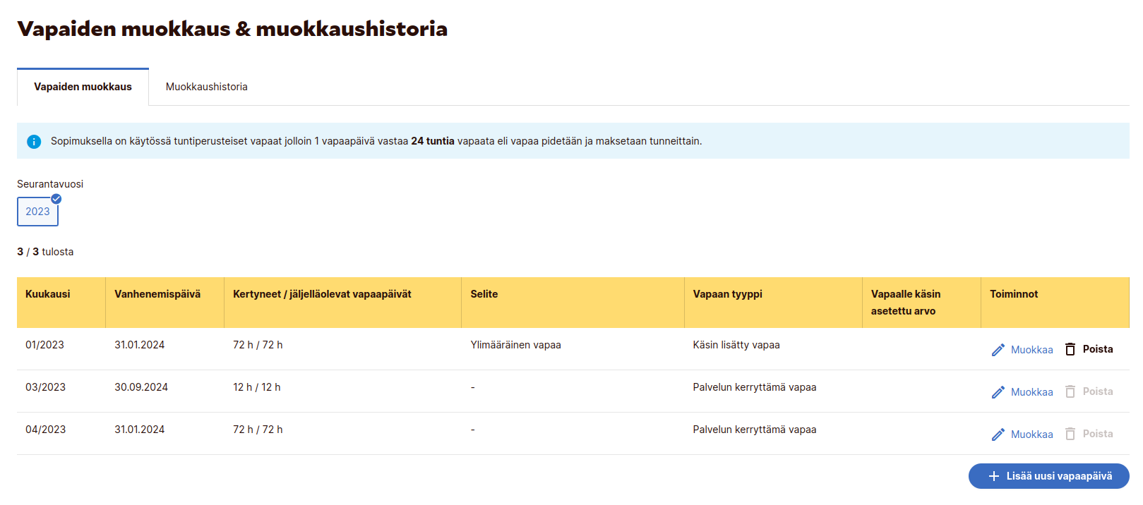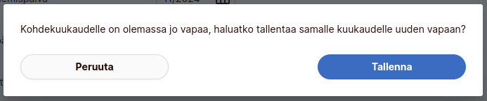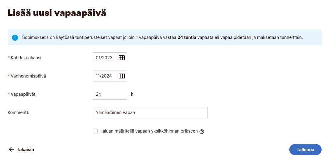 Käsin lisätystä vapaasta voidaan edellämainittujen tietojen lisäksi muokata kohdekuukautta sekä mahdollista valinnaista yksikköhintaa. Palvelun kerryttämille vapaille ei voi määrittää käsin erillistä yksikköhintaa sillä yksikköhinta määräytyy aina laskenta-asetusten perusteella. On tärkeää huomata, että mikäli aiemmin tallennetun käsin lisätyn vapaan kohdekuukautta muutetaan, ei palvelu laske enää vapaan vanhenemispäivää kohdekuukauden mukaisesti automaattisesti. Päivitä vapaan vanhenemispäivä tarvittaessa käsin.