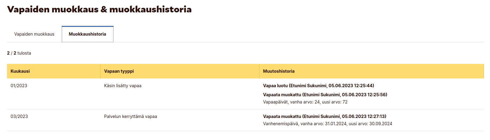 Vapaaeditorilla tehtävät muokkaukset näkyvät erillisessä muutoshistoriassa. Muutoshistoriassa näytetään muutoksen tekoaika, muutoksen tekijän henkilötiedot (kuvassa esimerkkimuodossa) sekä muutetut arvot. Mikäli vapaarivi poistetaan kokonaan, poistuu myös kyseisen vapaan muutoshistoria eli jos vapaa halutaan "poistaa" muutoshistoria säilyttäen, on vapaan saldo nollattava.