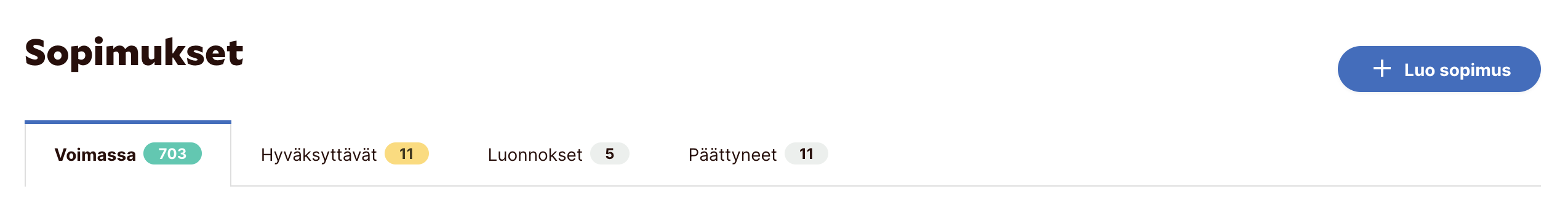 Uusi sopimus lähdetään luomaan painamalla “+ luo sopimus”-nappia.
