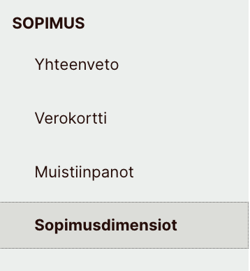 Sopimusta tehdessä ensin tulee valita sopimuksen esiasetukset, joita käytetään raportoinnissa. Esiasetuksissa olevat valinnat perustuvat hyvinvointialueen Oimassa oleviin asetuksiin. Sopimukselle valittuja esiasetuksia pystyy muokkaamaan sopimuksen tiedoista kohdasta "Sopimusdimensiot". Tällä toiminnolla sopimuksen voi siirtää esimerkiksi toisen kunnan alle tai toiseen asiakasryhmään.