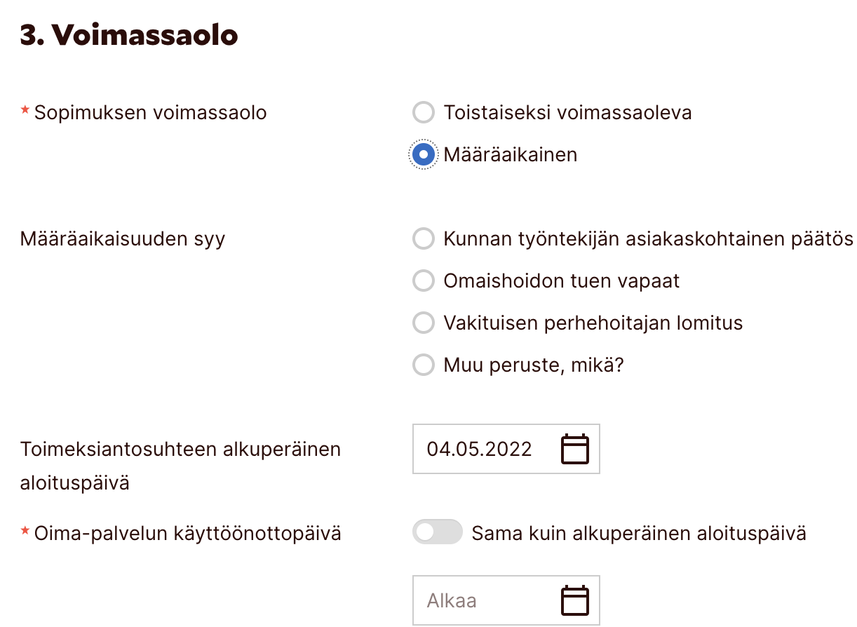 Oima-palvelun käyttöönottopäivä viittaa siihen päivämäärään, josta palkkionmaksu tulisi alkaa. Tästä päivämäärästä avautuu myös hoitojakso, jolle hoitaja pääsee tekemään merkintöjä. Oima-palvelun käyttöönottopäivä voi olla sama, kuin toimeksiantosuhteen aloituspäivä. Tällöin kyseessä on kokonaan uusi sopimus. Tämän valinta on pakollinen, koska se antaa ajantasaiset palkkiotaulukot sopimukselle.