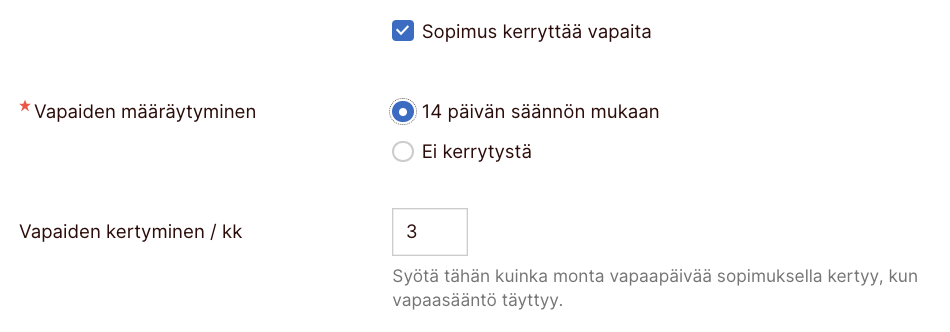 Vapaissa saattaa olla valmiita valintoja riippuen etukäteisasetuksista. Voit tehdä muutoksia valintoihin. Mikäli sopimukselle valitaan "Kerryttää vapaita" ja "14 päivän säännön mukaan", jokainen hoitojakso, jolla tulee täyteen vähintään 14 hoitopäivää, kerryttää "Vapaiden kertyminen / kk" -lokeroon syötetyn määrän vapaita.