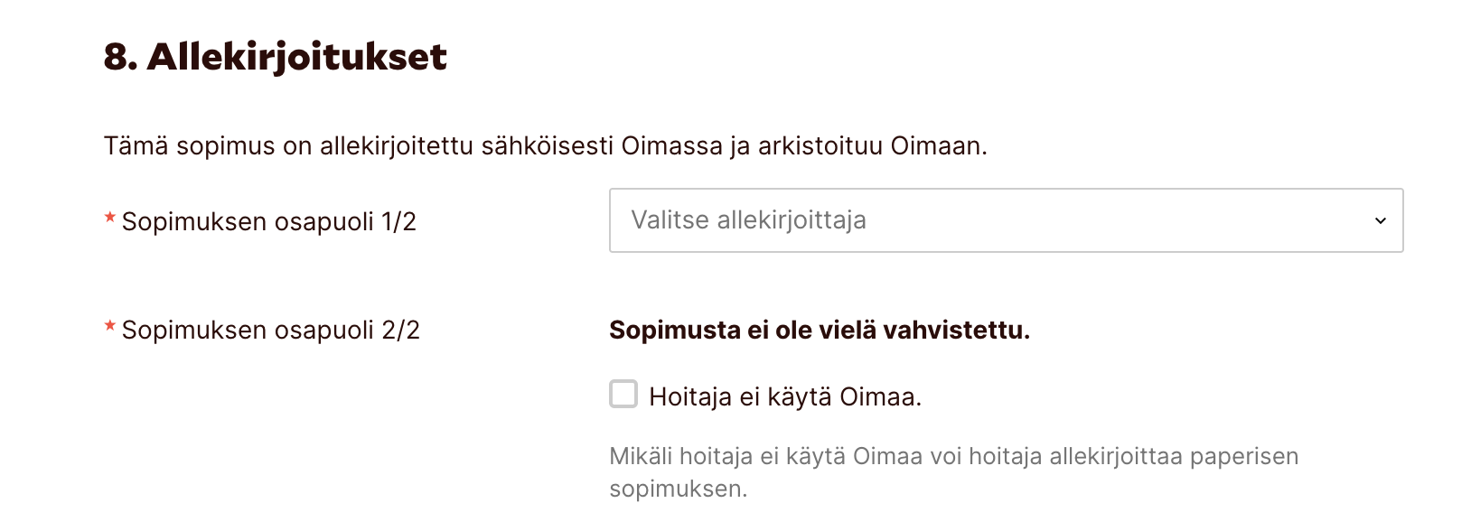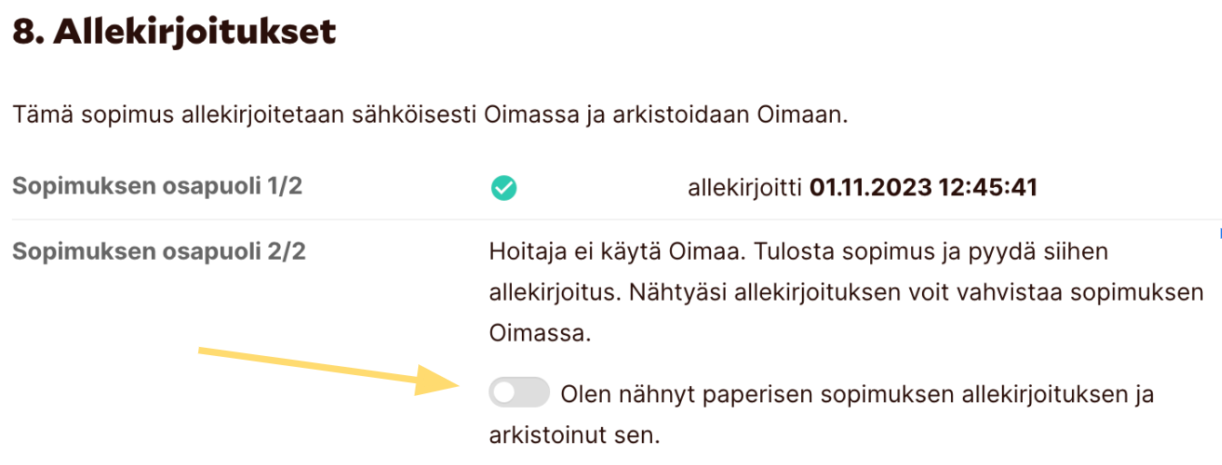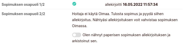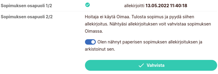 Jos hoitaja ei käytä Oimaan eikä pysty allekirjoitamaan sopimusta sähköisesti, allekirjoitus tehdään tulostettuun pohjaan. Tällöin sopimus tulee vahvistaa Oimassa hyvinvointialueen edustajan toimesta. Tämä tehdään, kun hoitaja on allekirjoittanut paperisen version. Paperinen versio on arkistoitava hyvinvointialueen menetelmillä.