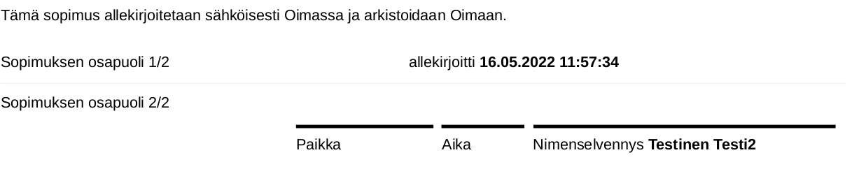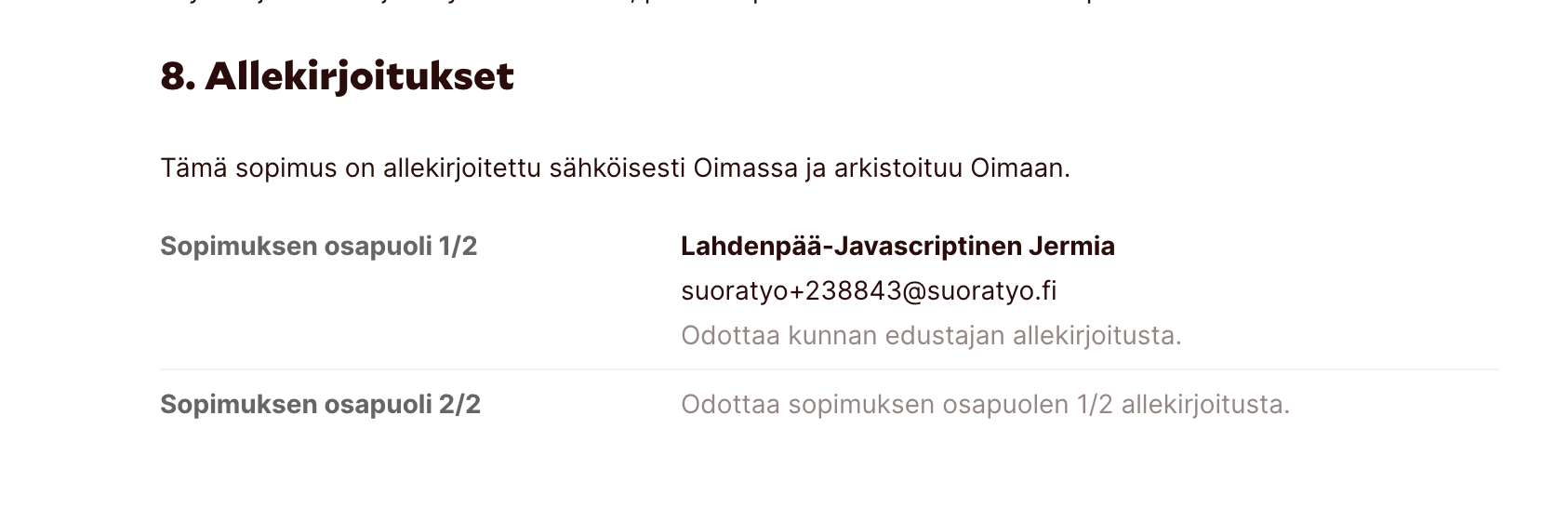 Sopimusta tarkasteltaessa näet ovatko molemmat osapuolet allekirjoittaneet sopimuksen. Mikäli kummatkin osapuolet käyttävät Oimaa, niin heille molemmille lähtee sähköpostiviestillä pyyntö kirjautua Oimaan allekirjoittamaan sopimus sähköisesti.