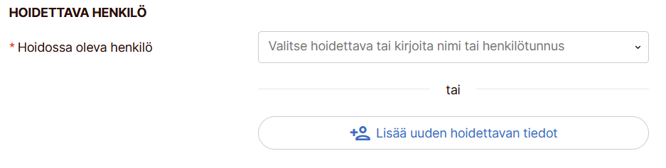 Kun molemmat hoitajat ovat sopimuksella, valitse hoidettava henkilö joko kohdasta "Valitse hoidettava" tai "Lisää uuden hoidettavan tiedot". Mikäli lisäät hoidettavan tiedot, tämä tapahtuu samalla tavalla kuin hoitajan tietojen lisääminen.