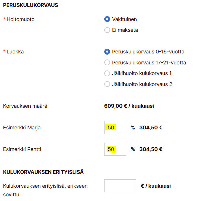 Tämän jälkeen voidaan määrittää myös kulukorvauksen jakoperuste hoitajille, joka on Kuvan 9. esimerkissä 50 %. Lisäksi sopimuksella voi olla mahdollisuus määrittää vielä kulukorvauksen erityislisä.