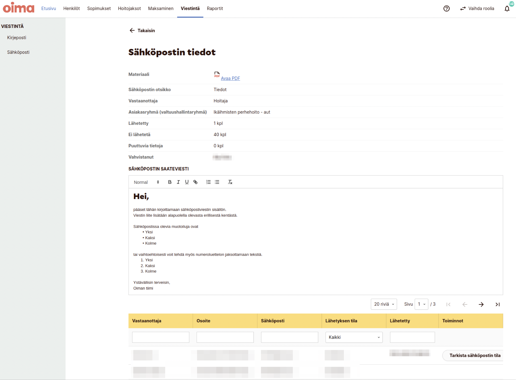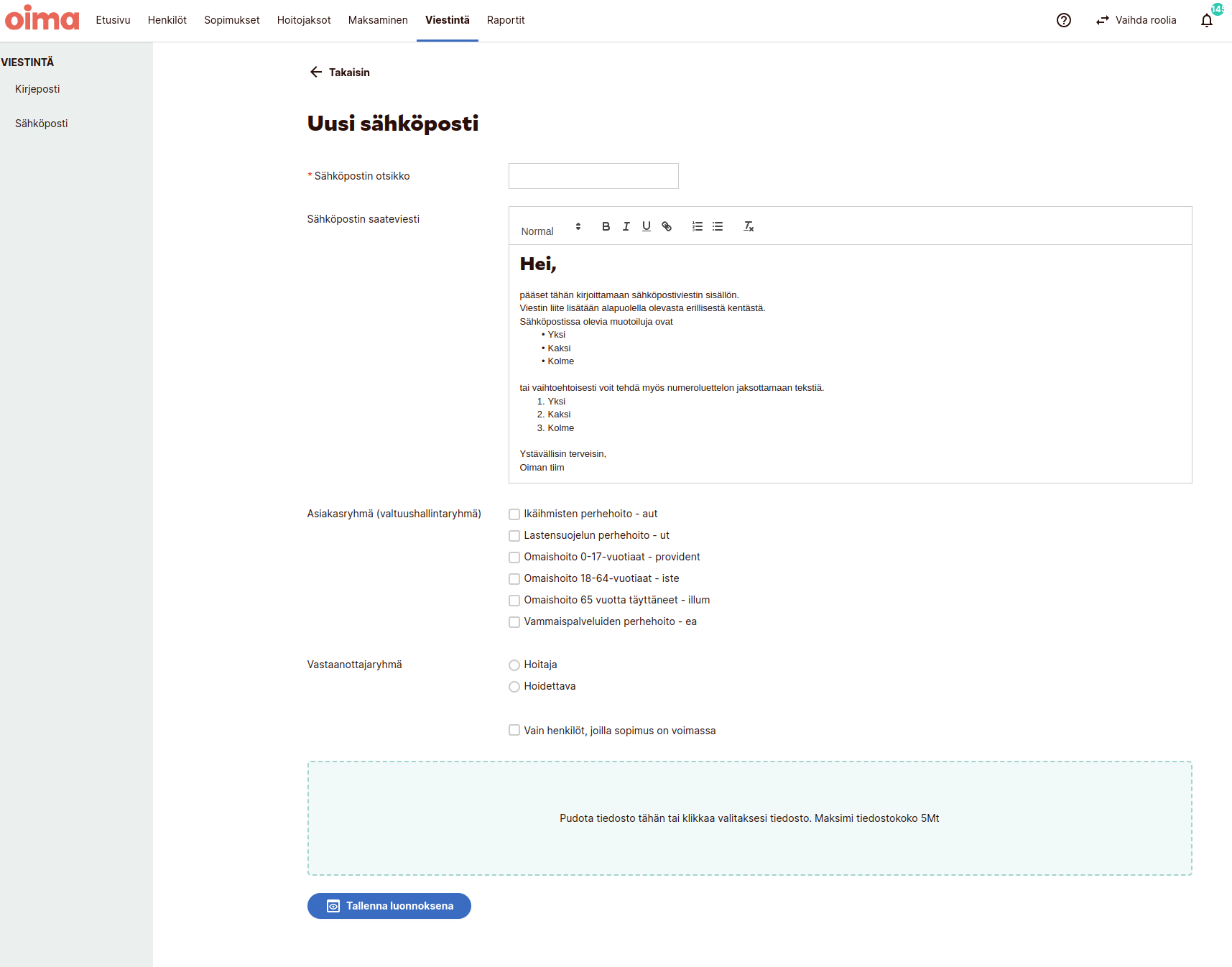 Pääset kirjoittamaan ja lähettämään sähköpostiviestin valitulle asiakasryhmälle Viestintätyökalu-kohdasta. Oima-palvelun sähköpostitoiminnolla voi lähettää kaikki tiedotteet ja uutiset eri vastaanottajaryhmille, tai vain yksittäisille asiakkaille/ asiakkaalle.