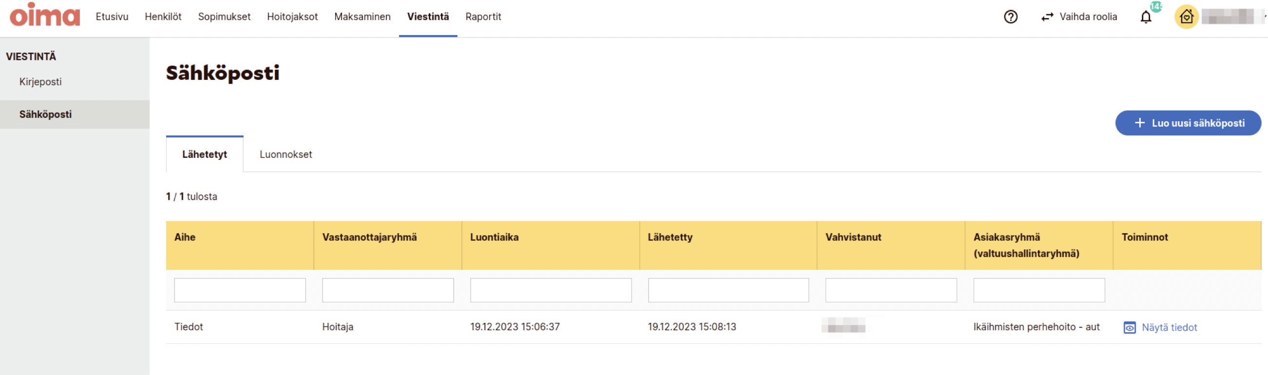 Viestintä toiminto löytyy käyttöoikeuden saaneilla henkilöillä yläpalkin valikosta, Viestintä- kohdasta. Valikossa näkyvät arkistoituna lähetetyt sähköpostit, kirjeet ja luonnostilassa olevat viestit.