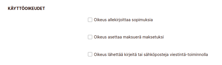Käyttöoikeudet saa lisättyä laittamalla ruksin kohtaan ”Oikeus lähettää kirjeitä viestintä” -toiminnolla.