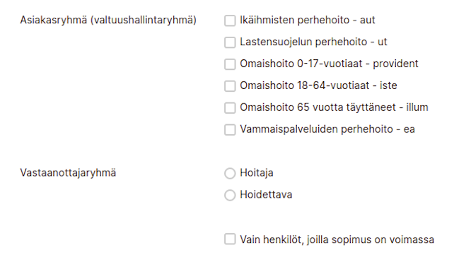 Uutta sähköpostia luodessa ensin kirjataan sähköpostiviestin otsikko. Tämän jälkeen pääset valikoimaan sähköpostin asiakasryhmän ja vastaanottajaryhmä (hoitaja/hoidettava). Seuraavaksi valitaan vastaanottajaryhmä hoitomuodon, kirjanpidon kustannuspaikan, kuntakoodin tai toiminnon mukaan. Jos sähköposti halutaan lähettää esimerkiksi vain henkilöille, joilla on sopimus voimassa, tälle on oma valintaruutunsa.