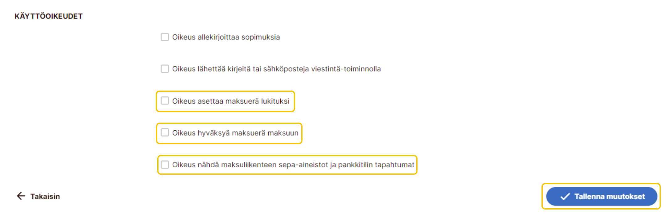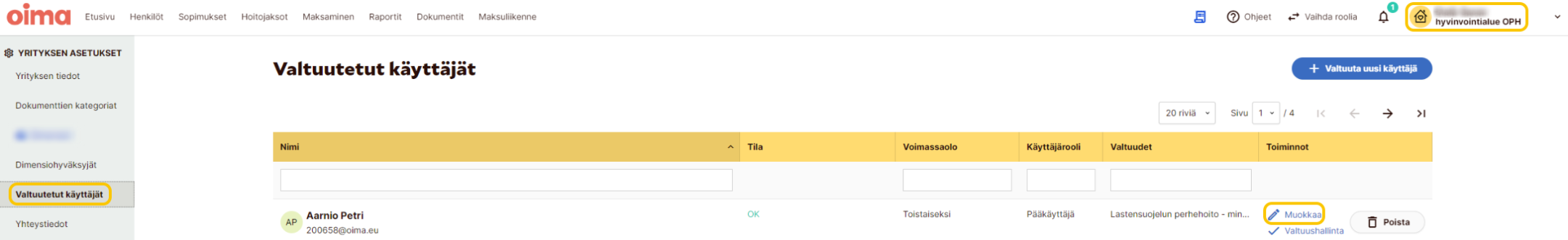 Maksamisen käyttöoikeuksia hyvinvointialueen pääkäyttäjät pystyvät muokkaamaan valtuutetuista käyttäjistä. Tallennetut käyttöoikeudet astuvat heti voimaan: