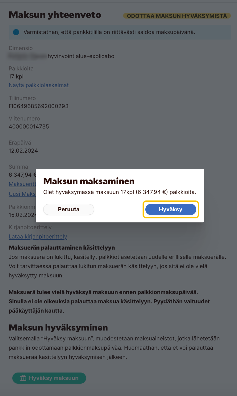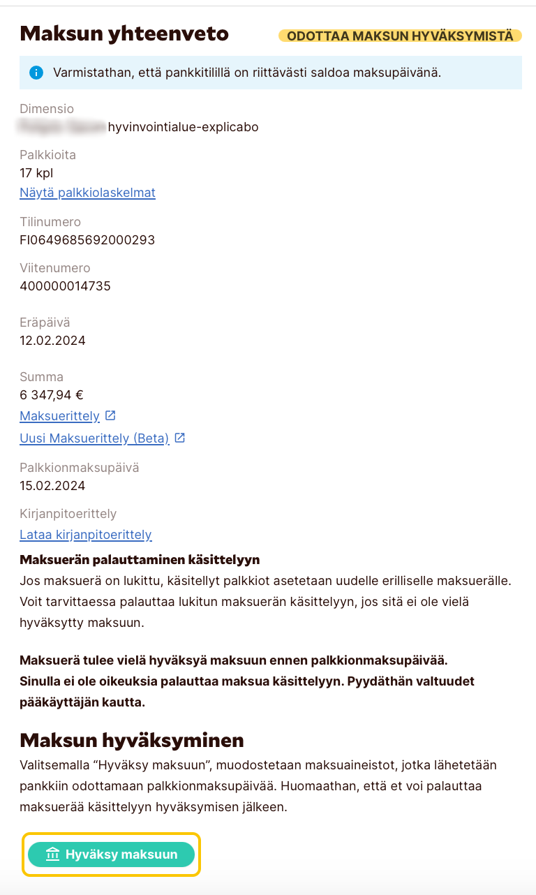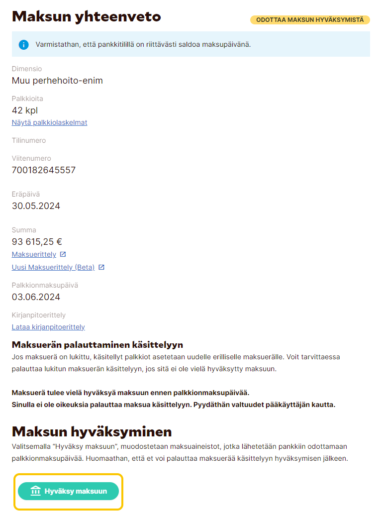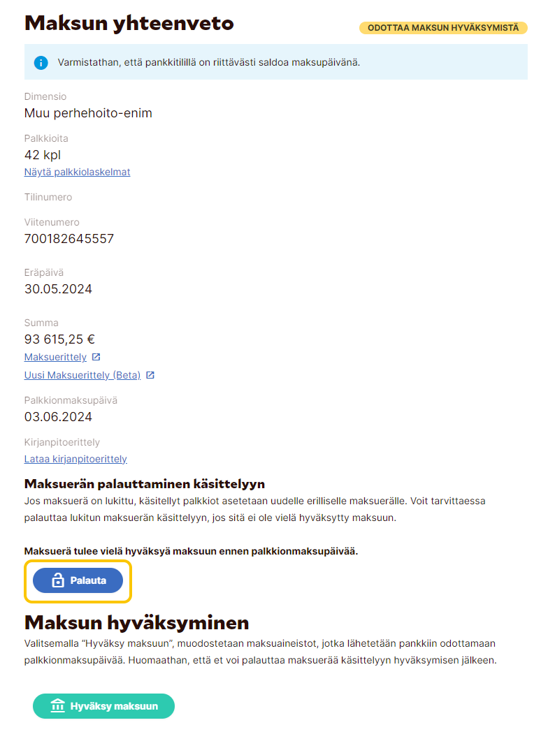 Käytäthän toimintoa harkiten. Jos palautat maksun käsittelyyn, muista hyväksyä maksuerä uudelleen maksuun ennen eräpäivää.