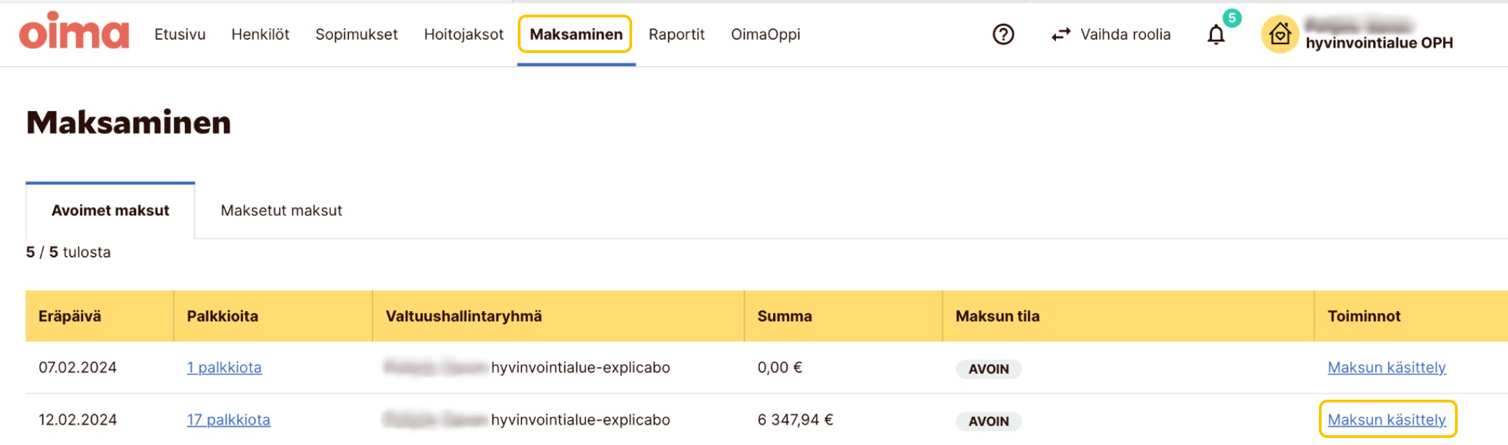 Jos Oima- palvelussa on maksuerä joka on lukittu, mutta hyväksymättä maksuun, hyvinvointialueelle lähtee huomautus palveluun merkityille Rahaliikenteen yhteydhenkilöille maksuerän eräpäivänä klo 10 ja klo 14.