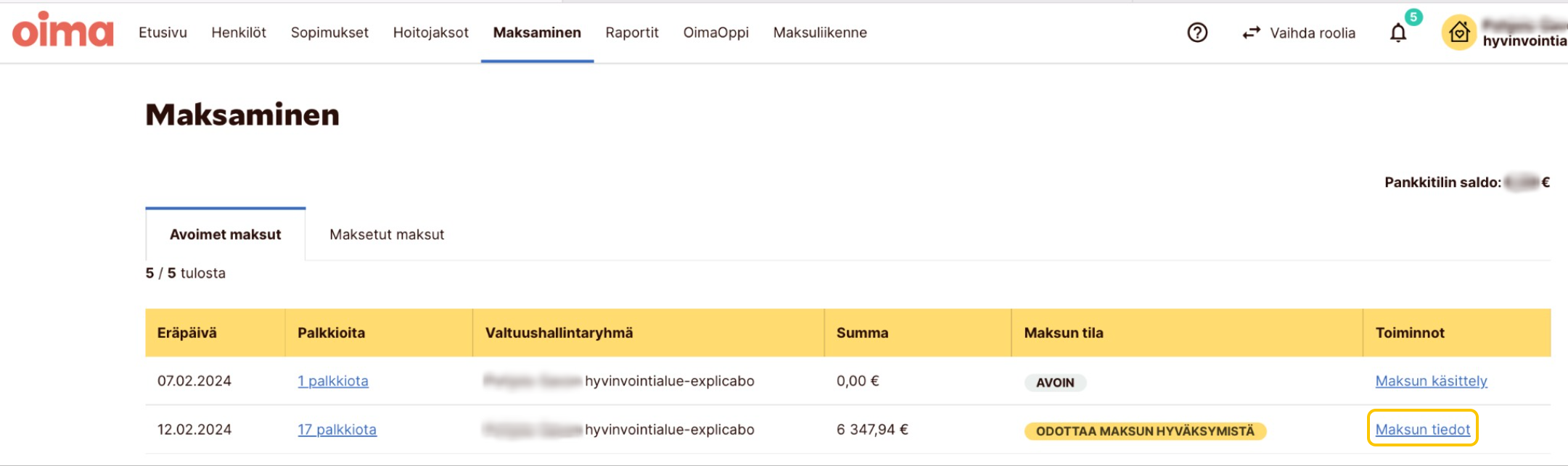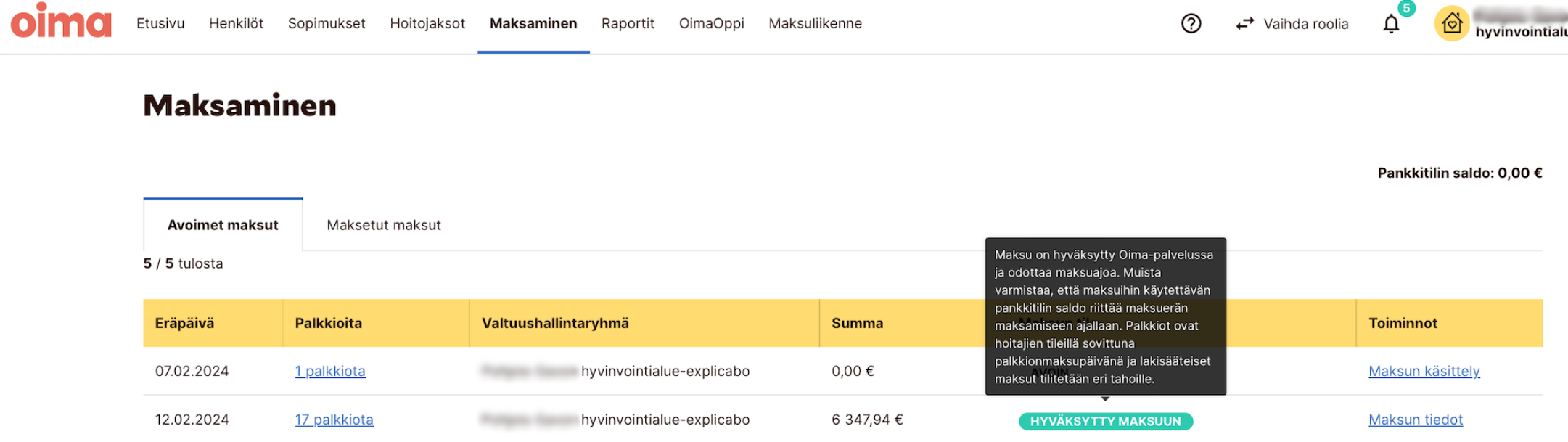 Tämä ohje koskee vain hyvinvointialueita, jotka käyttävät hyvinvointialueen omaa pankkitiliä palkkionmaksamiseen Oima-palvelun kautta.