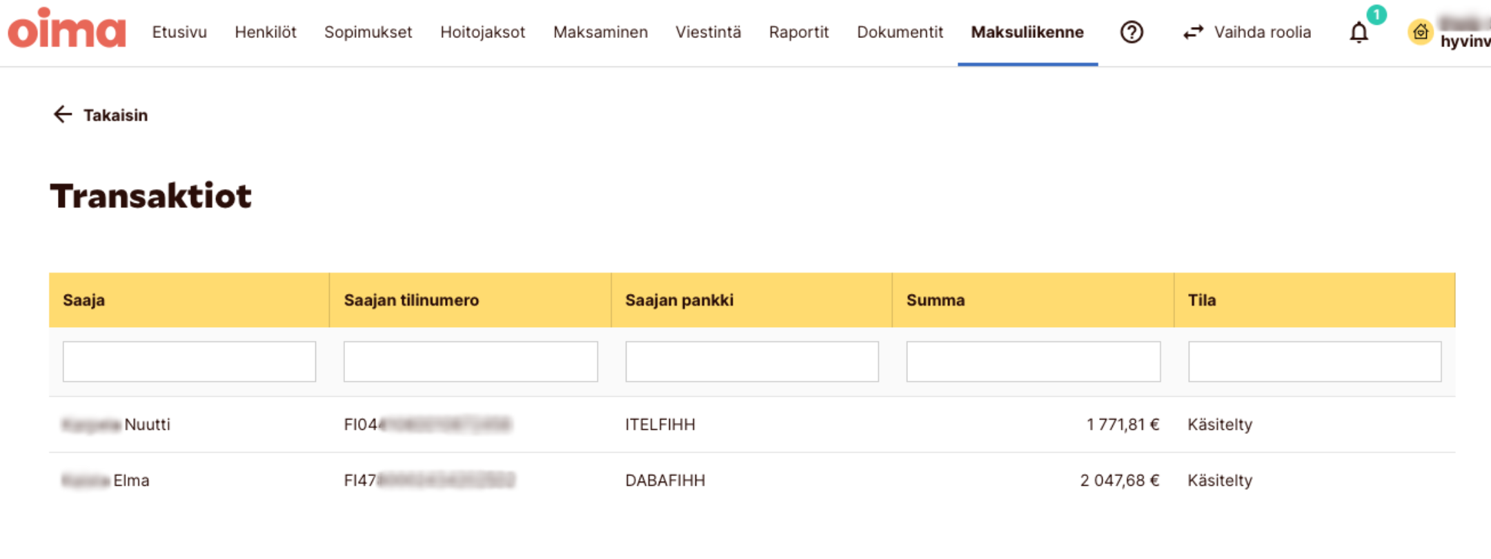 Maksuliikenne- välilehdellä valitsemalla transaktiot, näet kyseisen maksuerän osalta yksittäisten palkkioiden tarkemmat tiedot. Voit esimerkiksi haun avulla tarkastaa mille tilille palkkio on maksettu.