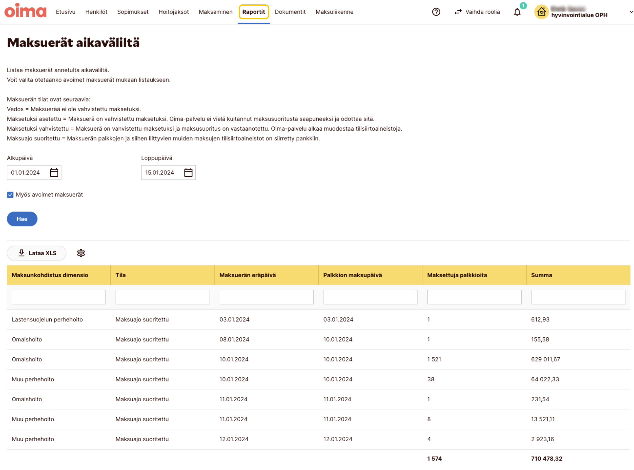 Raportit- välilehdeltä löydät Maksuerät aikaväliltä- raportin. Pystyt listaamaan maksuerät haluamaltasi aikaväliltä. Valitse mukaan myös avoimet maksuerät, jos olet tekemässä koontia tietyn palkkionnmaksupäivän summista. Maksupäivät näkyvät raportilla, kun maksuajo on suoritettu.