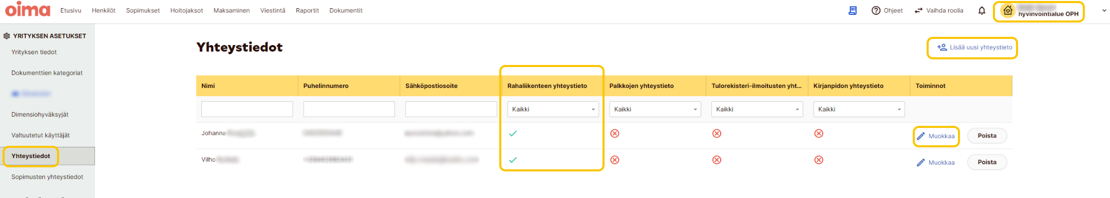 Rahaliikenteen yhteystietoja pääsee pääkäyttäjät muokkaamaan Yrityksen asetukset- valikon kautta Yhteystiedot- välilehdeltä. Rahaliikenteen yhteystietoja pääsee muokkaamaan henkilön kohdalta "muokkaa"- napin kautta, tai lisäämään "lisää uusi yhteystieto"- kohdasta.