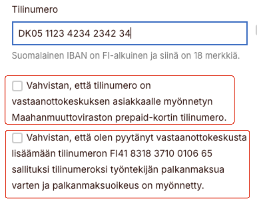 - Hyvinvointialueen tulee ilmoittaa vastaanottokeskukselle se tilinumero, josta työnantaja maksaa palkan kortinhaltijan tilille