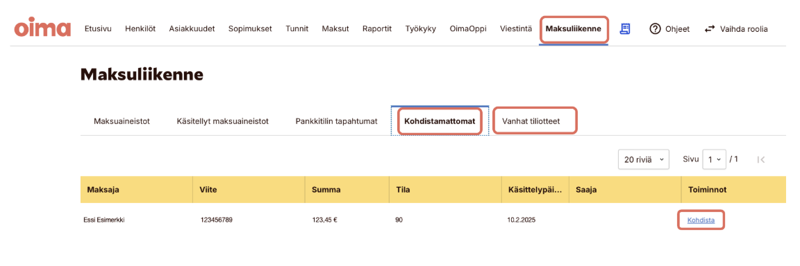 Hyvinvointialueet, jotka käyttävät Oima-palvelussa hyvinvointialueen omaa pankkitiliä maksamiseen, pääsevät käsittelemään Oima-palvelussa kohdistamattomia tapahtumia maksaminen-välilehdellä. Tällaisia voivat olla esimerkiksi palkankorjausten palautukset, jotka ovat maksettu virheellisellä viitenumerolla tai viestikenttää käyttäen. Lisäksi vanhat, Oiman asiakasvaratilin tiliotteet löytyvät Maksuliikenne-välilehden takaa omalta sivultaan!