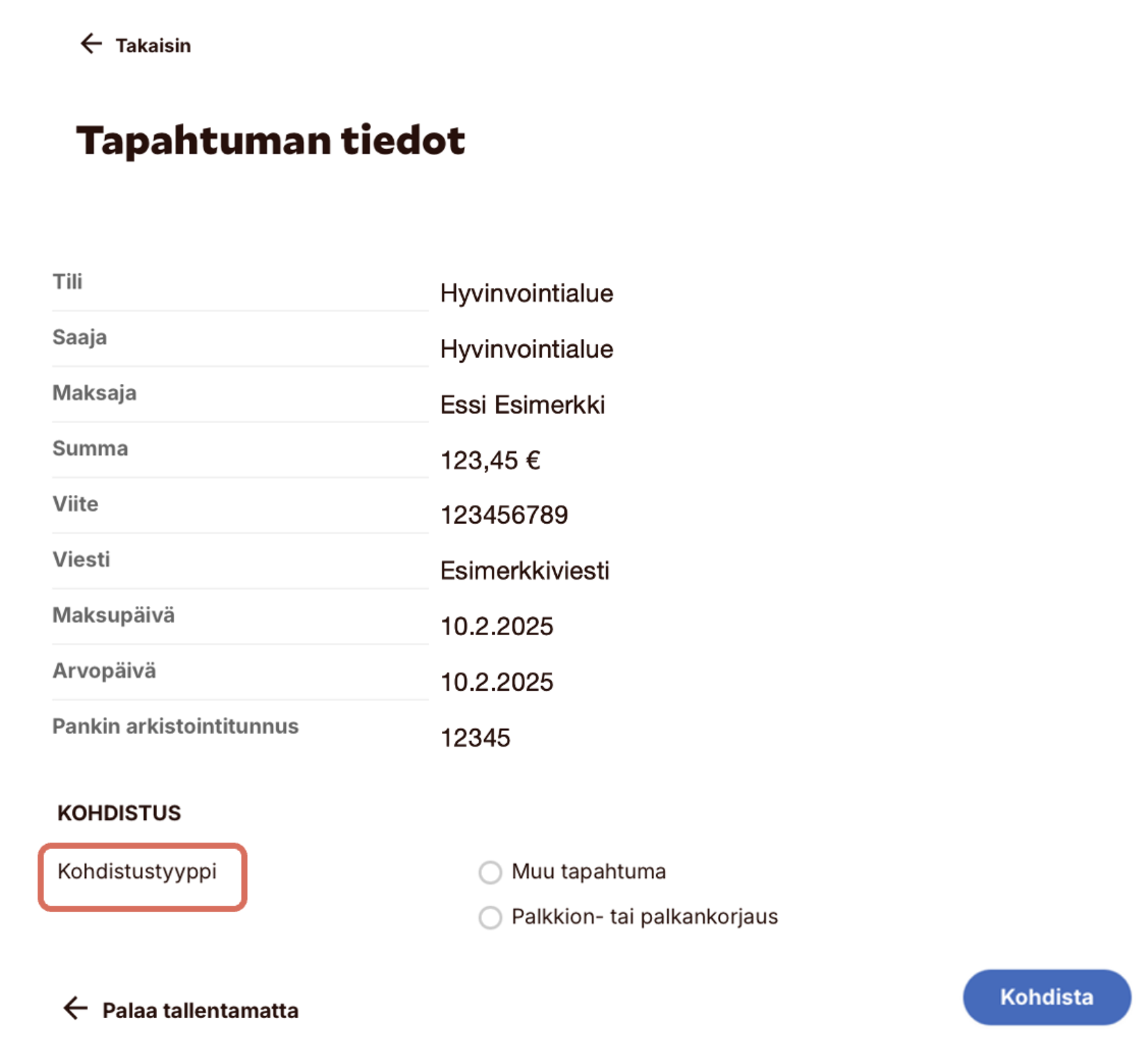 Muu tapahtuma -kohdistustyyppiä käytettäessä virheellinen kohdistus on mahdollista poistaa Pankkitilin tapahtumat -sivun kautta, kun avaat Tapahtuman tiedot ja valitset Poista. Korjausmahdollisuutta pyritään laajentamaan mahdollisimman pian.