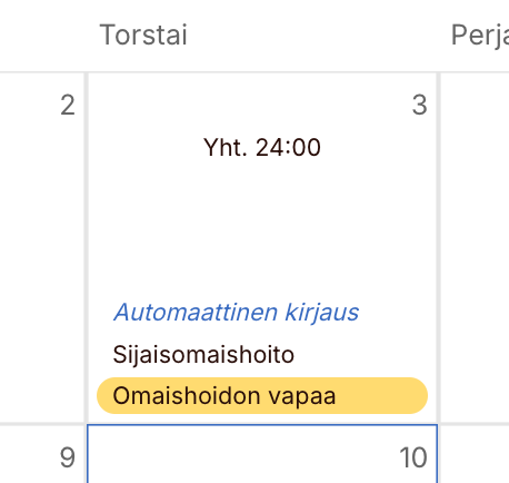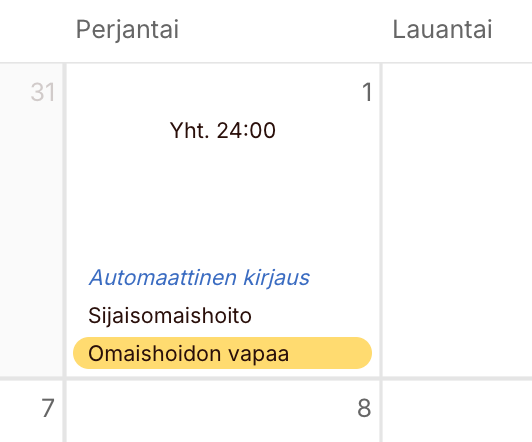 Varsinaisen omaishoitajan kalenterissa operaattorille näkyy vapaapäivät, jotka ovat tulleet automaatiolla sijaishoitajan merkintöjen kautta. Tällöin kalenterissa lukee "Automaattinen kirjaus"