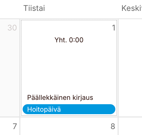 Sijaishoitajan kalenterissa voi näkyä hoitopäivä, jossa on merkintä "Päällekkäinen kirjaus"