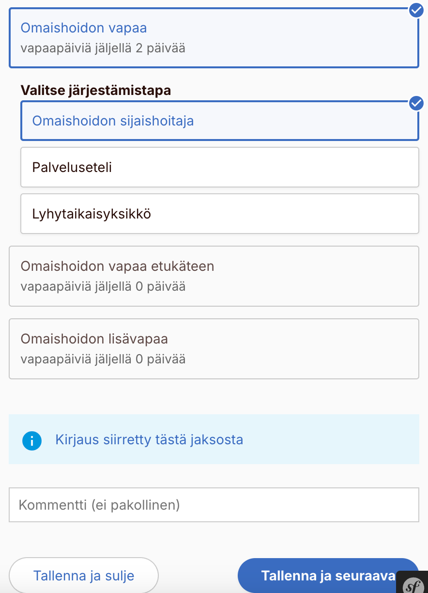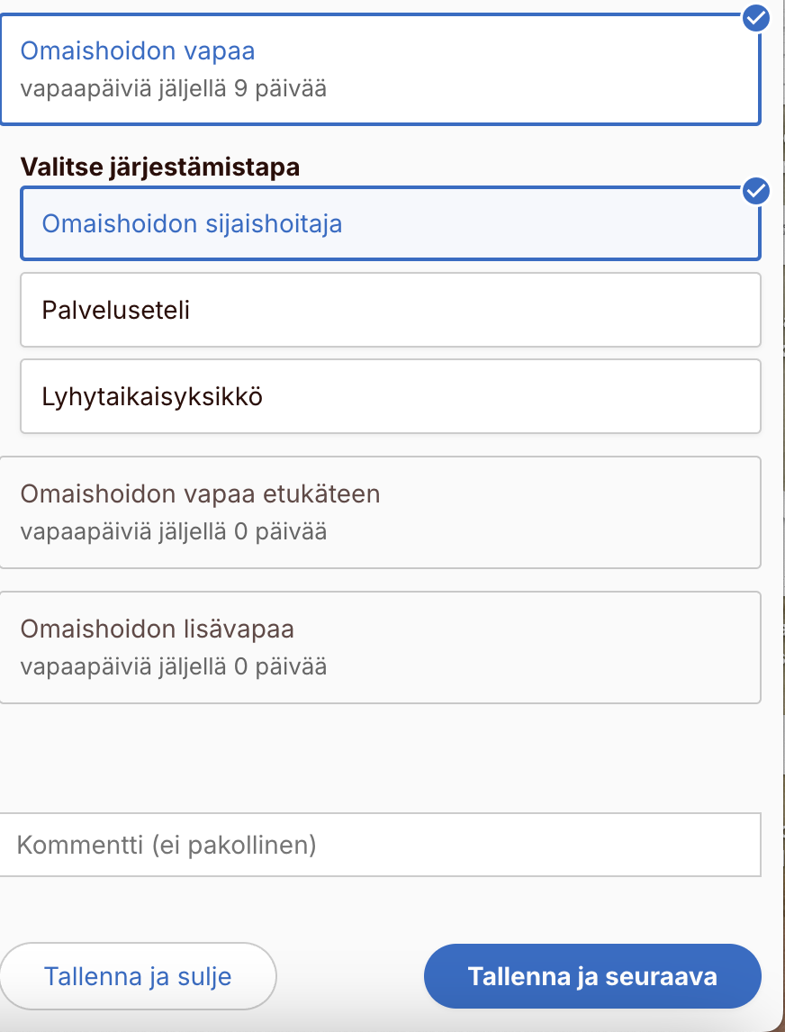 Omaishoitajan tulee valita vapaapäivää syöttäessään oikea vapaanjärjestämistapa. Omaishoitajan kirjaukset eivät siirry sijaishoitajan kalenteriin.