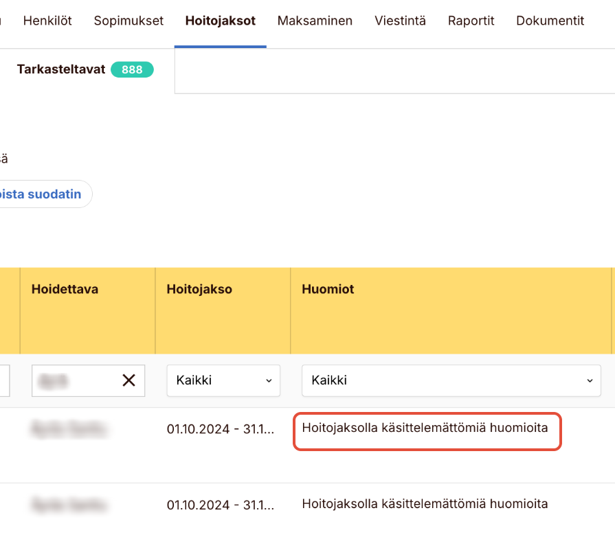 Halutessasi voit määrittää myös, että hoitojaksot nousevat aina tarkasteltavien listalle.