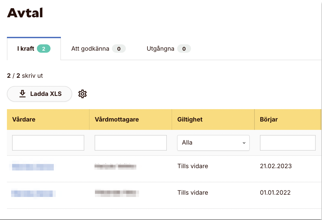 De uppdragsavtal som har sparats i tjänsten visas på sina egna flikar beroende på giltighet. Om det finns flera avtal skiljer du dem åt utifrån vilken person som är i vård och vårdformen.
