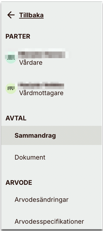 Genom att klicka på Kommun ansvarig för vården kan du granska önskat avtal och du leds till avtalets Sammanfattningssida.