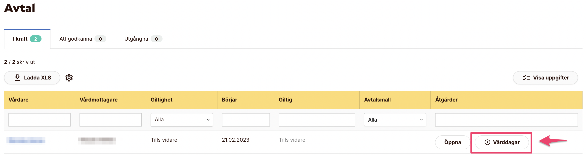 Samma knapp Vårdardagar finns också i avtalets vy högst upp.
