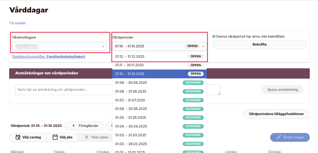 Tips: Om du har flera vårdtagare och redan har sparat dina vårdardagar för en vårdperiod, kan du byta till en annan vårdtagarens vårdperiod genom att välja en annan person från Vårdtagar-menyn. Detta påskyndar registreringen av vårdardagar för flera vårdtagare.