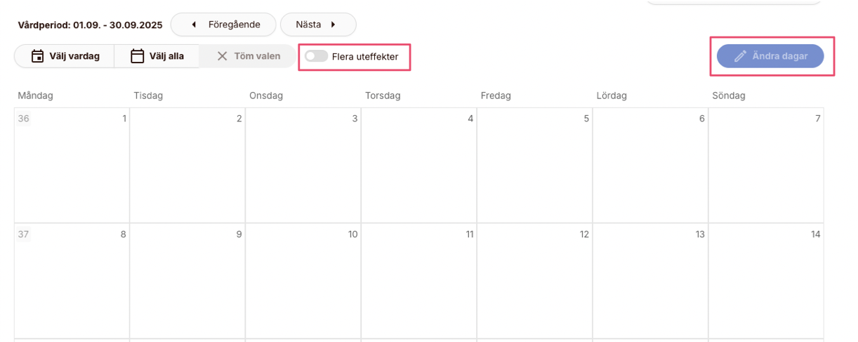 När du aktiverar Flerdagarsinmatning kan du rapportera flera dagar samtidigt om dagstypen och uppgifterna är exakt desamma. Välj först alla dagar i kalendern, vardagar eller enskilda dagar genom att klicka på önskade dagar och tryck sedan på Redigera dagar. Denna funktion kan också användas genom att hålla ner Ctrl-tangenten på tangentbordet och sedan Redigera dagar.