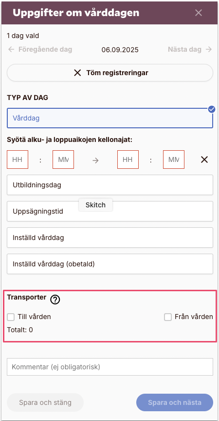Transporter kan registreras för vårdardagar om de är tillåtna i avtalet. Två typer av transporter kan registreras: till vården eller från vården.