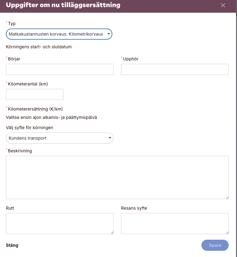 Med tilläggsersättningen kan du rapportera separat ersättningsbara kilometerersättningar. Tjänsten erbjuder automatiskt beskattningsmyndighetens fastställda pris.