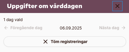Du kan korrigera rapporterade vårddagar så länge du inte har bekräftat vårdperioden. Öppna dagen i kalendern och ändra dagstypen eller rensa vårddagen helt. Kom ihåg att spara den ändrade eller borttagna registreringen av vårddagen.