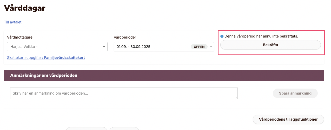 Obs! Om grunden för vårdarens ersättning är månadsersättning behöver vårdardagar inte rapporteras separat före bekräftelse, endast undantag (utbildningsdag, uppsägningstid, avbokad vårddag, familjevårdledighet, familjevårdledighet i förväg).