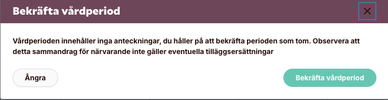 Om du bekräftar en vårdperiod utan någon registrering ser bekräftelsefönstret ut så här: