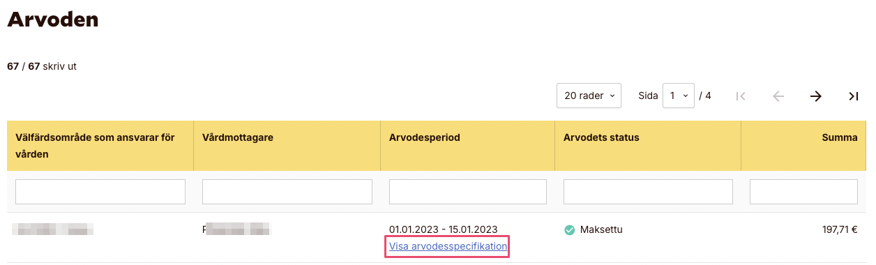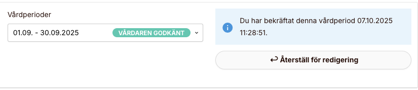Vårdperiodens status blir Tillgår accepterad. För en accepterad vårdperiod visas också datum och tidpunkt när du gjorde periodens bekräftelse. Om du i detta skede upptäcker ett fel i registreringarna kan du återställa vårdperioden för redigering själv. Denna funktion är tillgänglig tills ersättningsutbetalaren bekräftar ersättningen till betalning. Om du återställer vårdperioden för redigering, glöm inte att bekräfta den igen när registreringarna är korrekta.